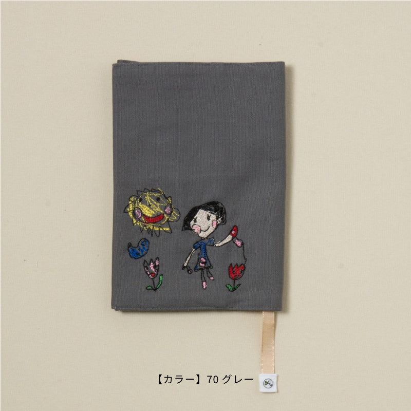 子供の絵を刺繍した、しおり紐付きのブックカバーです。