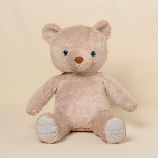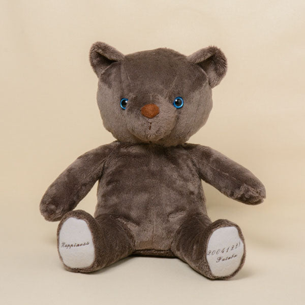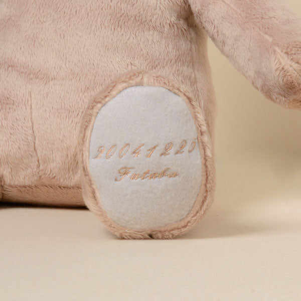 マイクロ糸を利用した毛並みのきれいでやわらかくなめらかな手触りのひなた工房のオリジナルベアです。5色の中からお好みのベアが選べます。両足裏にメッセージが入れられます。(メッセージは筆記体英数のみとなります。左右4段まで入れられます。)